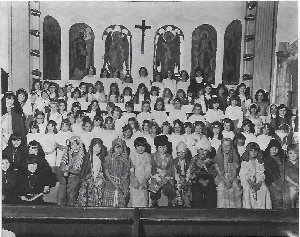 On 16th December 1976, two hundred children, all in traditional costume, packed the altar, and before a congregation of 250 presented the Christmas story in song and verse. Each child had a part to play but the main soloists were Helen McDonough, Helen Jenkinson, Kathy Latham, Fiona McFarlane, Moira McFarlane, Stella Johnson, Andrea Houghton, Michael Hodgson and Andrew Merrick. A collection for the Mother Teresa Fund, organized by the children resulted in £45.